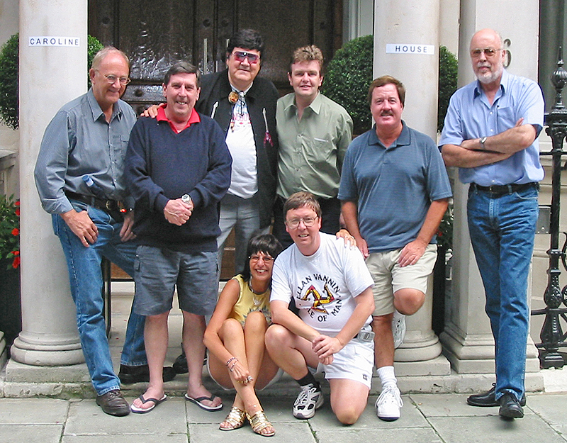 2002: Gordy is reunited with his pals from Caroline North. L to R, David Williams, Graham Webb, Nick Bailey and Mick Luvzit Gordy with pirates from all parts on the North SeaThe day after the 2202 Reunion. Outside Caroline House, 6 Chesterfield Gardens