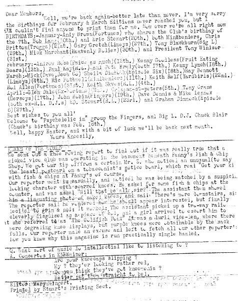 Feb 6th First Radio London Night. No info re compere or band Feb 13th Ed Stewart. No info re band Feb 20th Mark Roman. Band: The Exception Feb 27 John Edward. Band: The Style March 6th Mike Lennox. Band: Pussyfoot March 13th Tony Blackburn. Band: The Teapots (How approprate that the Teapots should appear with 'Teacosy' Blackburn – Webmaster) April 3rd Band: Yum Yum April 10th Ed Stewart. Band: The Switch April 17th Chuck Blair. Appearances by: David Essex, Mood Indigo April 22 The King George and the Harlem Kiddles Tour April 24th Pete Drummond. Band: Wages of Sin May 1st Chuck Blair. Band: Pussyfoot May 8th Ed Stewart May 15th Tony Blackburn. Band: The Style May 22 Mike Lennox. Bands: Episode Six, The Quadrant June 5th Tony Blackburn. Band: Late Hours June 12th Pete Drummond. Band: The Switch June 19th John Edward. Band: The Step June 26th Ed Stewart. Band: Craig King and the Midnight Train July 3rd Pete Drummond. Band: The Mooch July 10 John Peel July 17th Keith Skues Band: The Mooch. (Admission 4/6d) July 23rd Tony Brandon. Band: First Movement 31st July Band: The Unsolved 7th August Band: The Go Five |