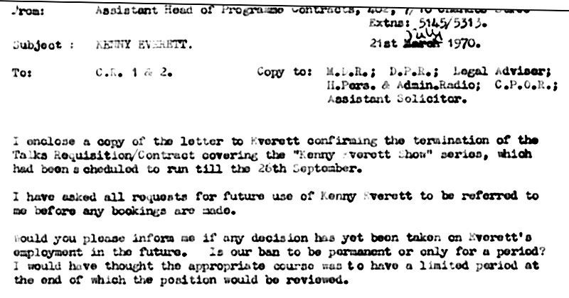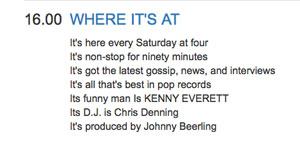 Johnny Beerling (who had learnt a few lessons in offshore broadcasting from a clandestine visit to the Galaxy) described Kenny Everett as: "I think probably the best disc jockey/presenter that we ever had on the BBC".