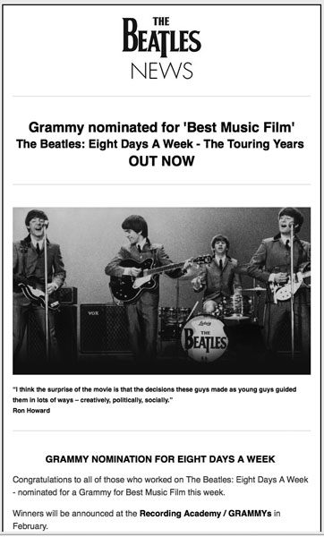 Webmasters Mary and Chris watched the premiere in Aylesbury: I'm sure that Chris and I aren't the only people who felt the main premiere should have been held in Liverpool, rather than London and Paul and Ringo should have insisted upon it. We watched the film at theAylesbury Odeon and would have liked to have had the opportunity to have seen the special clip referenced in the Liverpool Echo, that included some of the people we'd met there like Beryl Marsden (right). Why Eddie Izzard featured in the main film and they didn't, is a complete mystery. It seems nobody can make a documentary without wheeling in a 'celebrity' to offer their opinion. Luckily, it wasn't done a lot in the film, but why do it at all? No matter how valid someone elses's opinon of what happened, the people who were actually there are the ones who are interesting. I don't know where those 'Liverpool locals' interviews for the 'special clip' were conducted, but I was absolutely amazed when Ron Howard said he had never been to the city! I would have expected him to have made a point of paying a visit before he embarked on the film, to immerse himself in the Beatle culture and visit the National Trust childhood homes of Lennon (bottom right) and McCartney. Something that he would have appreciated from doing so would be to see that Beatlemania definitely continues to exist. Visitors to Aunt Mimi's house are known to be overcome with emotion and some even faint on entering John's former bedroom. Chris and I enjoyed the film and the restored footage of the concert in Shea Stadium that was shown at the end was fantastic. The footage illustrates clearly the evolution of the band from their early days as enthusiastic youngsters experiencing dizzy stardom. As encapsulated by the 'Eight Days a Week' title, it depicts how gruelling touring schedules and lack of privacy left them exhausted and cynical musicians who longed to come off the road, revert to being individuals and explore new music. Sadly there was not a terrific amount about the 1966 US Tour, so there were none of the glimpses we had hoped for of Kenny Everett, Ron O'Quinn and Jerry Leighton, who had been given the chance-of-a-lifetime opportunity to accompany the Beatles on tour as representatives of their respective offshore stations. John and Lyn Preston in Brisbane wrote: |