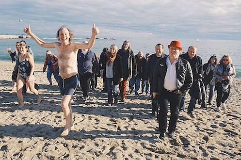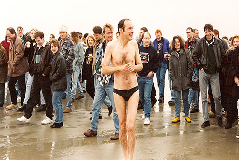 Braving the surf Dunkerque in November over fifteen years ago and perhaps slightly warmer seas in Barcelona – although most of the specatators seem to have coats on! |