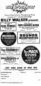 Radio London has been assisting Chris in contacting people who may have worked or performed at the Uppercut. Resident DJ Roger Day and manager Gordon Sheppard have already responded and John Edward recalls introducing Stevie Wonder at the club, while wearing a hired, blue suit! If any of our site visitors is able to contribute personal memories, please contact Mary, who will pass on all mail to Chris. It would be particularly good to hear from those who participated in the 'Big L Discoveries of Tomorrow' talent contest, run on Sunday evenings from January '67. Two Uppercut advertisements have been added to the Fab Forties for 150167 and 050367 |