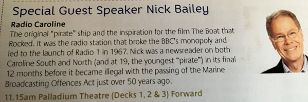 R Ray Clark tells us: Back on the ship, you can imagine my surprise when I read of the next day's guest speaker - Nick Bailey!