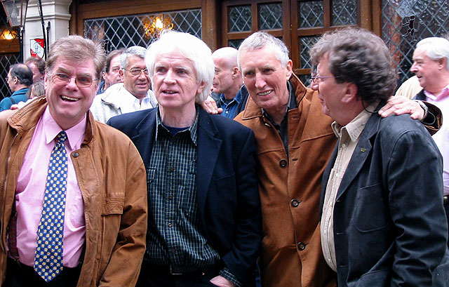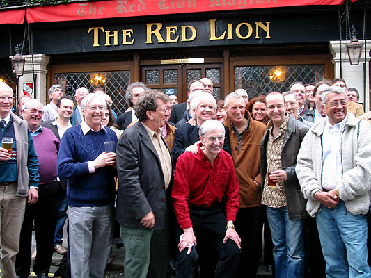 After Doggett's, there was no stopping Ronan attending reunions and he seemed to enjoy them! This one, organised by Roger Day (centre, in front of Ronan) commemorated Caroline's 40th Birthday, March 28th, 2004. It was held at the Red Lion pub, the watering hole just around the corner from the station's offices in Chesterfield Gardens.