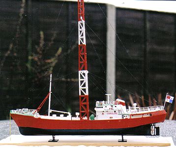 MIKE SAYS: I was interested to see the model of the Ross Revenge on your great web-site and thought you might like to see the one that I have constructed using the very same model. I hope that you like it, as you can see a lot of work has gone into getting it as near accurate as possible. The main pictures, as you can see, are of one ship in almost finished condition. I have, in fact, made two and they are both now finished and look great if I do say so myself. (See photo below) The first one I am going to keep, the second I intend to put on e-bay. I spent a lot of time on the Ross and did quite a few broadcasts from the ship i.e., several RSLs and also probably the last time she broadcast illegally from inside British waters. They were great days and I miss the ship and all those involved at the time greatly. My health stops me going to stay on the ship now but making the models has brought back a lot of great memories, looking at photos of the Ross, etc, to help in making the models. Keep up the good work with your site it's well worth it LA and kindest regards,Mike Stewart |