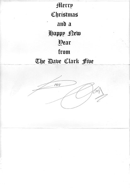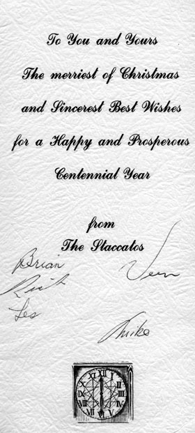 The Staccatos who signed the card were Les Emmerson, Vern Craig, Mike Belanger, Rick Smithers and Brian Simm. |