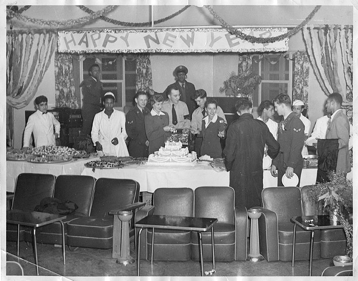 An undated New Year photo - but is that a wedding cake in the centre? It looks rather posh for a New Year celebration. It's difficult to tell what Chuck and the young lady on his left are doing, but they are not cutting the cake. They are holding a box. (They could be drawing raffle tickets.) |