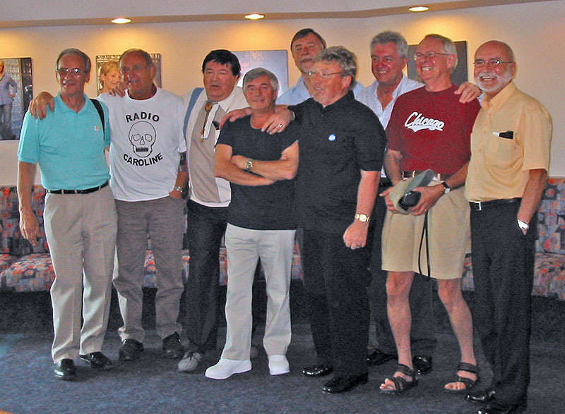 2002: Gordy is reunited with his pals from Caroline North. L to R, David Williams, Graham Webb, Nick Bailey and Mick Luvzit Gordy with pirates from all parts on the North SeaThe day after the 2202 Reunion. Outside Caroline House, 6 Chesterfield Gardens
