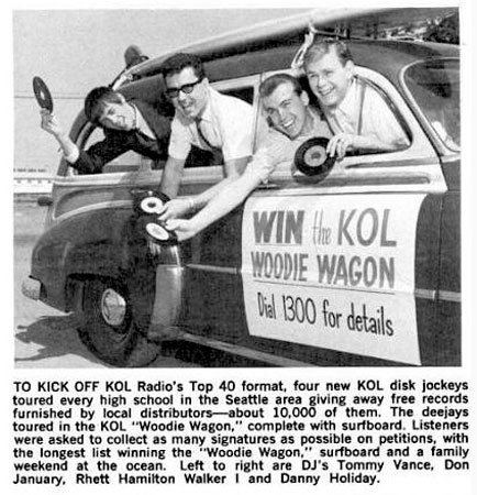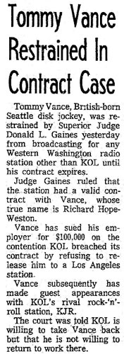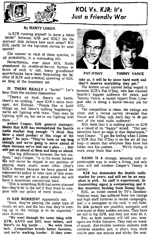 The Seattle press reported a supposed KOL vs KJR local radio war in 1965 (left) – with TV pitched in the ratings against the long-established Pat O'Day. The youthful TV, allegedly 'a recent import from Liverpool', sports a Beatle haircut, while Pat looks and (according to the feature) sounds staid. KOL appears to be the trendy station in the ascendancy. However, the writer, Marty Loken, felt the war was far from won, as fickle teenage listeners "may think you're gear one minute and zilchy the next". The contest below, left, which was used by KOL to launch the new Top 40 format, was clearly aimed at young hipsters. Not long after, however, Tommy appeared to have reached his own conclusion that KOL was 'zilchy' when he was offered an exciting opportunity to move to LA and join the renowned KHJ. He began waging his own war against his Seattle employers, and tried to sue the station, but he lost the battle.