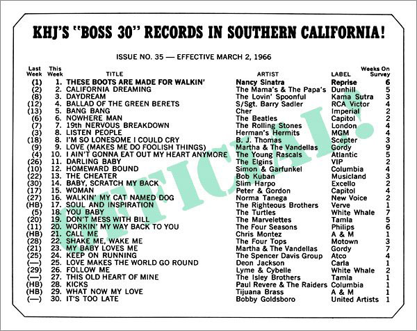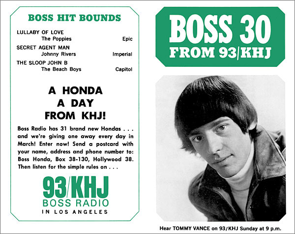 Tommy's last KHJ coverstar appearance before departing for England and Caroline. Appropriately, the #1 is 'These Boots Were Made for Walking'. (That week it was #2 on the Caroline Countdown for a second week running and about to leave the Fab Forty at #36, having been #2 a fortnight earlier.) Images from the 93KHJ blogspot. Thanks and congratulations to webmaster Ray Randolph on a superb site. |
