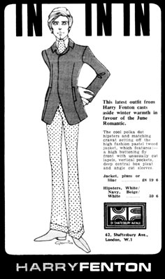 Fenton-on-Sea? Greg Bance, who broadcast on Roy Bates' Radio Essex, suggests that the town was re-named "in honour of Harry Fenton, gentleman's outfitters and purveyors of fine threads to stylish '60s mods bobbing around offshore. ("Fenton flashing": showing off some tasty narrow-lapelled jacket lining.)" (Right) Did Greg attire himself in a pair of these 'Spotty Muldoon' hipsters – and has he still got them? |