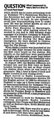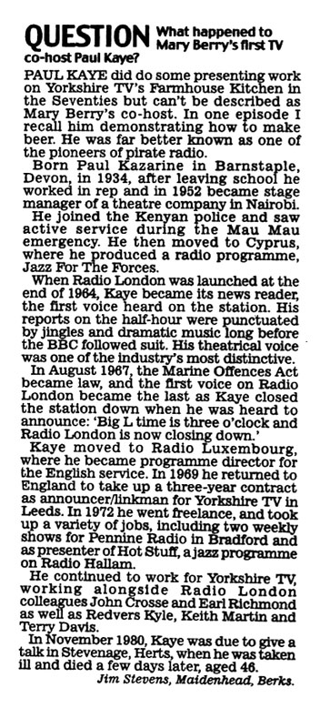 Paul Kaye and Mary Berry Amongst our press cuttings, we have the TV Times listing for an edition of the programme where Paul made beer and Mary made ginger pop! (Thanks to Alan Field for finding it amongst our many pages!) |