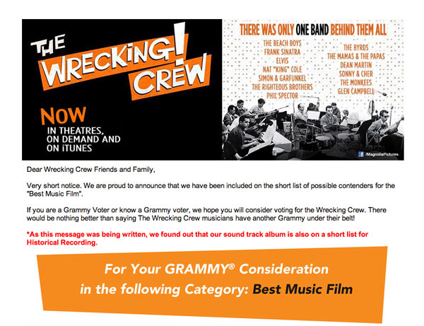 "What the Funk Brothers did for Motown, the Wrecking Crew did, only bigger, for the West Coast Sound. Six years in a row in the 1960s and early 1970s, the Grammy for 'Record of the Year' went to Wrecking Crew recordings." The Wrecking Crew were Hal Blaine, drums, Tommy Tedesco, guitar, Carol Kaye, bass, Al Casey, guitar, Earl Palmer, drums, Plas Johnson, saxophone, Joe Osborn, bass, Don Randi, Keyboard. The musicians featured on countless records in the Fab Forty, but you will not spot their name anywhere in the chart. They were the Los Angeles session musicians who played on Big L hits by the Association, Byrds, Scott McKenzie, Nancy Sinatra, Sonny and Cher, Monkees, Righteous Brothers, and many other top artists. The Wrecking Crew musicians were also the 'bricks' in Phil Spector's Wall of Sound. The Wrecking Crew! documentary is produced and directed by Denny Tedesco, son of the 'Crew's' late guitarist Tommy and its release has been long awaited. The main stumbling block for any feature film of this nature, is obtaining licensing for the music. In 2013, Denny Tedesco decided to go for Crowd Funding through Kickstarter. The Wrecking Crew! surpassed its goal of $250,000 to $312,000. The movie is being distributed by Magnolia Pictures. Ed Ryba in Los Angeles attended a local screening: Ed points out that when searching for The Wrecking Crew! on the net, be sure to include the exclamation mark. Without it, search engines turn up a lot of results about American baseball. The DVD, containing 6 hours of bonus material, is out now. |