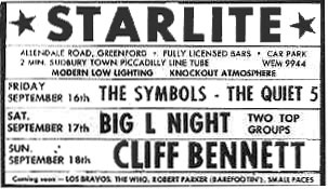 Stevie Wonder at the Starlite "Here's another bit of forgotten music history that has a Radio London connection. I remember Big L adverts mentioning events they were presenting at the Starlite ballroom Greenford. I didn't even know where the ballroom was until quite recently. It's in a parade of rather run-down shops in Sudbury, now likely to be demolished. See the article in Ealingtoday and there's also a Facebook page for save the Starlite." Albertina McNeill who headed the campaign to save the Starlite was particularly interested to confirm rumours that Stevie Wonder had appeared at the venue. In October 2015, we received the following email from Jackie Farrington: "As I lived in Sudbury Town in the 60's I can assure you that Stevie Wonder did appear there in person (starlight ballroom) I was there that night and remember it well." Albertina tells us she has received confirmation from two other people that Stevie appeared at the Starlite, and one of them also recalled seeing Ike and Tina Turner there, but she says, unfortunately, this info is not going to be enough to save the ballroom. Mark Roman compared a Big L show at the Starlite Ballroom on April 22nd 1967, introducing the Symbols and Knees Club favourites, the Knack. The Symbols are also promoted in the 1966 advert on the left, for September 17th, where the 'Two Top Groups' for the Big L Night must have been a last-minute booking, as they remain unnamed. Apart from the Roman Emperor, some of the biggest stars to appear at the Starlite were Them, Cream, Pink Floyd, Jeff Beck and Steampacket. |