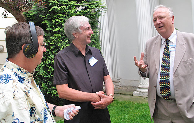 Chris Payne interviews Roger Twiggy Day with John in the grounds of the former Radio England offices, 32 Curzon Street |