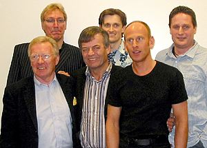 from Ian "Many thanks for your last e-mail have been in touch with Christine from the States and she e-mails me quite often now great to hear from her after so many years. Have also been in touch with Gordon Sheppard, whom I worked with at Capital Radio as well as Radio London, so it was really nice to hear from him too. I am progressing and exercising three time a week with gym and swimming at a local golf and leisure centre but I am not golfing! It is interesting looking at the new details on the Radio London web pages always something interesting to read - keep up the good work. Cheers Ian D" [Photo: Ian (back) with Big L chums Purpleknees Edward, (left) Willy Walker and Cardboard Shoes (front)] |