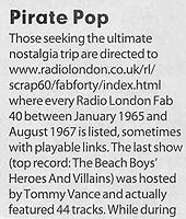 talking of the Fab Forty... Cheers, Fred! We were surprised and delighted to discover that in the September issue of Mojo (the cover photo is of Syd Barrett), Fred Dellar features our Big L Fab Forty in his Surf's Up column (subtitled Online Booty Unearthed), describing it as 'the ultimate nostalgia trip' (Short extract, right). Well done to the Fab Forty psephologists (that's 'chart-compilers' to you!) and welcome to any new visitors who have arrived here via the Mojo link. Of course, the easy way to get straight to the Fab 40 is to go to www.biglfab40.com or via the link on our Home page! (Many thanks to the Pirate Radio Hall of Fame) |