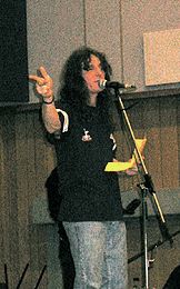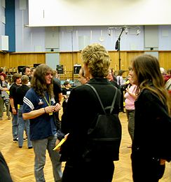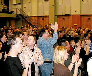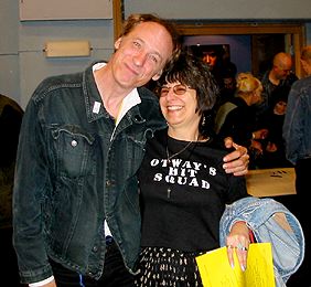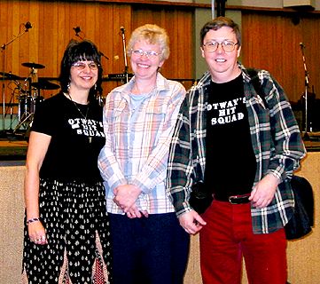 At the door to Studio One, we were greeted by Patsy Andrews, one of the very hard-working organisers, and we all signed-in on a huge card, to prove that we had really been a part of Otway's choir. Inside, T-shirts were already available with all 900 choir-member names printed on them.When everyone was present, Otway and the band performed a couple of 'warm-up' numbers and then we rehearsed for our big moment. At first, the 'choir' wasn't quite managing to heckle together, but after a bit of practise, we improved. (That's my story, anyway.) We even got to 'sing' (a term used very loosely here ) a couple of lines and a chorus at the end of the song, with Otway heckling us! |