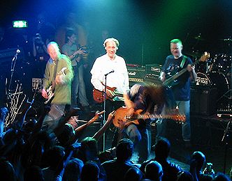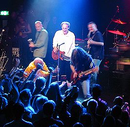 What could anyone do to top an experience like that? Go to the Mean Fiddler in Charing Cross Road in the evening, and record the video promo to go with 'your' single, that's what! Otway held the rough mix of our record in his hand like a holy relic, as his 'choir' manhandled him (another holy relic) from the stage to the back, to present the disc to the guy manning the PA desk. Our masterpiece was then played so that we could mime to it for the video recording. A pity the chior managed to drop Otway on the way back to the stage, though! Luckily, the same fate did not befall Richard, who was afforded the same honour, accompanied by his guitar.