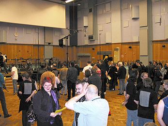 Next, the members of Choir #2 queued outside the studio building, where we were handed our yellow 'lyric sheets'. There was no room for artistic improvisation it was vital that everyone shouted the same heckles at the same time! I think most of us felt quite in awe of the building we were about to enter. We filed in when told, in a well-behaved crocodile, along corridors lined with posters for movies with soundtracks recorded in 'our' studio, among them Harry Potter and the Philosopher's Stone, Lord of the Rings, Shrek and Star Wars Episode 1. The yellow sheet informed us that we were recording 'next door to a rather large orchestra who cannot be disturbed'. The studios are obviously modelled on the 'Tardis'; as it says on the Abbey Road website, "It's much bigger on the inside than the outside!"