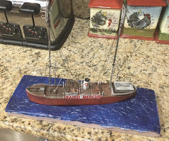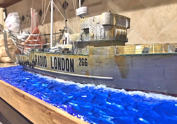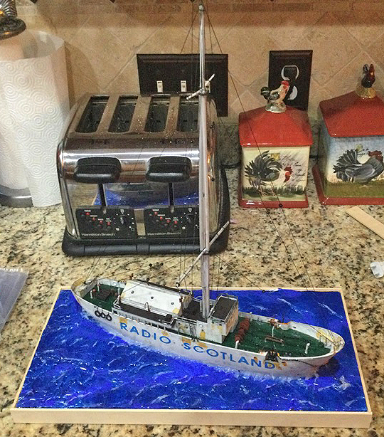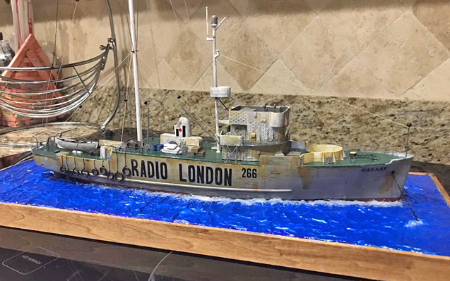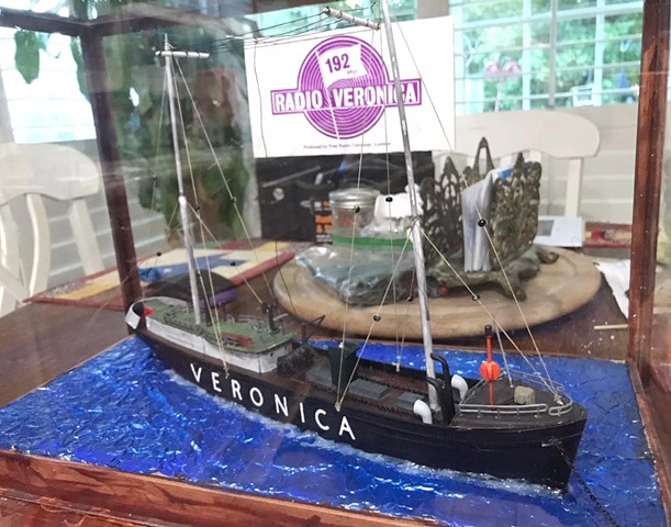 My name is John Pate and I reside in Sugar Land, Tx, just outside of Houston. I have been making models since around the age of 6. I never really mastered it, but is a enjoyable pastime. I have always been a radio geek. It started with me listening to weird noises on a old tube/valve Airmaster radio and then I played around with a better antenna to get improved reception. All this led to me getting a ham radio license back in 1974. I worked as a engineer/board operator at WGAC 580 kHz, a small AM station. This was many years before the age of the internet, so pirate radio was stations on just below the 40 meter band (7 MHz). I enjoyed listening to those and also to the spy number stations. Ah, the enjoyable days of the Cold War propaganda – the BBC, Radio Moscow, VOA, RCI, and many others! Next came career, family, those things that make you set aside your hobbies for other responsibilities. I still listened to shortwave off and on and built a model here and there. Fast forward to the early 2000s, when the internet introduced me to many new radio concepts. While fiddling around, I came across the subject of pirate/offshore radio. I researched it more and became fascinated by this time in radio history. Being in the US, I have to get most of the books, old souvenirs, etc from the UK. Then I found YouTube and discovered show clips from the various ships. I have a thing for jingles, so the Radio London PAMS jingles really stood out and ran through my head! Over time I saw a Facebook group dedicated to Pirate Radio ships, so I thought, "Hey, I can probably do that." I gave making models of the ships a shot and now I'm hooked! My first try was, of course, Radio London. I saw several photos on the Radio London website and converted the old Lindberg minesweeper kit into the MV Galaxy. I used various sizes and shapes of Evergreen styrene and K&S metal tubing to modify the kit into something that represented MV Galaxy. I cut the 'Radio London 266' logo on my Cricut machine, but it took a long time to find a font that matched. I also built a case for the ship so no dust can attack the radio antenna rigging that I painstakingly tried to recreate. I used small black glass beads as insulators. The model was airbrushed using acrylics and weathered with various acrylic washes. With the completion of the Radio London ship, I was happy with the outcome, so I created a Radio Veronica from a Revell North Sea fishing trawler, heavily modifying the aft portion to simulate the Norderney. I also built her a case.
