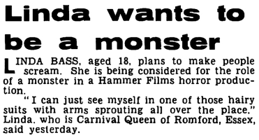 A strikingly attractive 19 year old blonde Linda Bass in those days hailed from Millbrook Gardens, Gidea Park, Romford, Essex