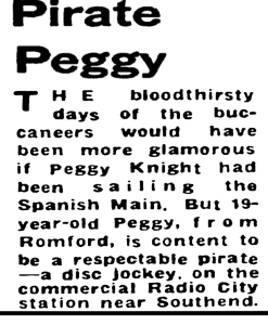 Crowned Romford Carnival Queen, Reg Calvert saw the publicity value in adding her to the roster of DJ's, she was slotted into the programme schedule on Saturday afternoon & named Peggy Knight
