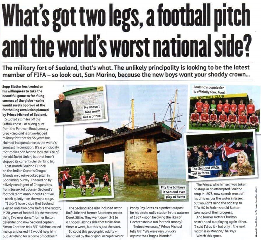 Football on Sealand might join the FIFA world cup. One of the early signings is said to be the Suns showbiz editor after Michael's son Liam joins the team to playing in Malta. The idea is to raise a team of 'Didn't quite make it' footballers with sponsorship. The idea's being put together by a guy called Neil Forsyth who is a sports writer and author
