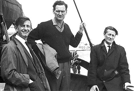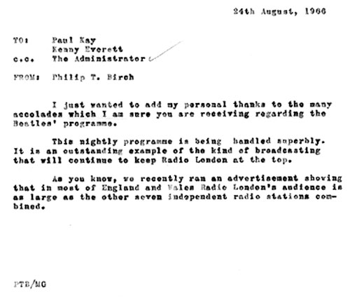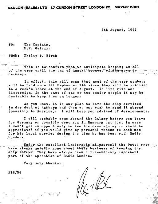 This really is the end of an era for me as Philip employed me personally, in December 1964. I think he was the reason I gave up my creative job with Aluminium Foils to join Big L. Although I was originally interviewed by Alan Keen, I was then taken to meet Philip, who, after a very pleasant chat, offered me the job in Advertising. I don't think I would have taken the risk (it was a risk) if I had not had the time to meet Philip. It was his calm yet enthusiastic manner that most impressed me. You felt that the business was in safe hands, and therefore it had a good chance of success. Your tribute made excellent reading. Well done! Ronagh and Ben Toney with Elizabeth and Philip Birch A note from Philip congratulating Paul Kay on producing the programmes In the picture below, Philip (centre) is seen with Paul Kay to his right and DJ Earl Richmond to his left Radio London's Promotions Manager, Gordon Sheppard (far right) with Philip on the tender to the Galaxy. A music press advertisement for the new release by Jon – one of the bands represented by the Philip Birch Agency Philip with Paul and Barry Ryan and Programme Director Ben Toney. Aboard the Big L tender with DJ Tony Brandon (left) and engineer Mike Howell One of the last memos from Philip to Galaxy captain Bill Buninga The Galaxy was painted green towards the end of her life as a radio station Photo credit: the late Andy Wright (courtesy of Charles Wright and the Felixstowe and Offshore Radio Facebook Page) Links to features and events referenced in this tribute:The Launch of the Radio London Club The Launch of the Big L Discothéque The 'Big L Film' – Dateline Diamonds Captain Bill Buninga's personal memorabilia |