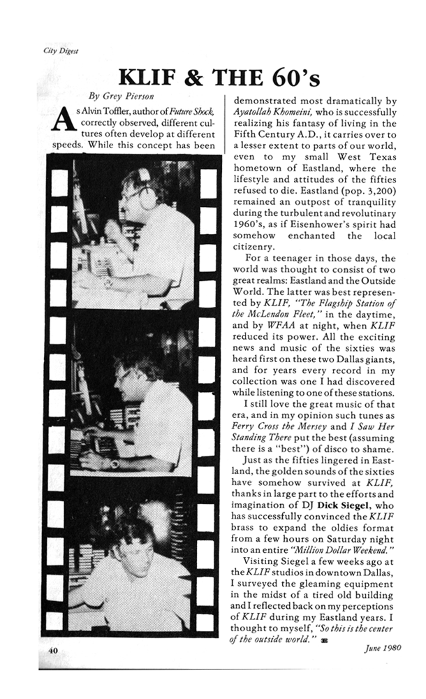 In the same edition of Irving City Digest, Grey Pierson wrote about his memories of listening to KLIF in the Sixties