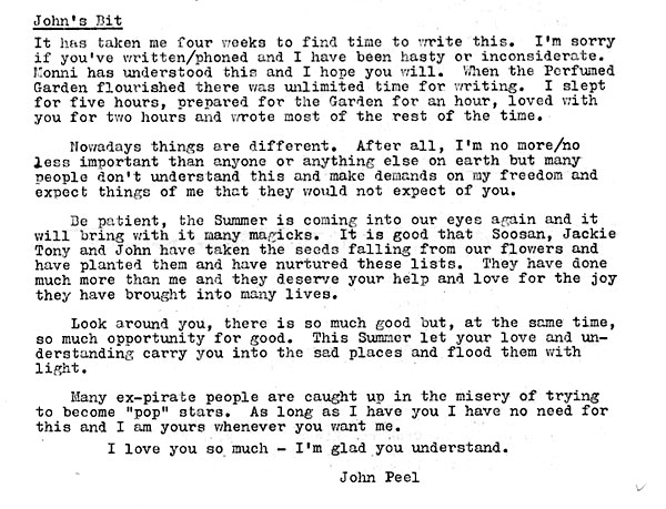 Phil Jones was a member of a very active group of fans of the Perfumed Garden, which continued long beyond the demise of Radio London. Members lobbied Robin Scott to give Peelie full-length programmes on Radio One. (Look where that led!) Phil has very kindly scanned group newsletters, some with contributions from the Perfumed Gardener himself, which make fascinating reading. There are also extensive membership lists, which Phil has scanned in the hopes of recontacting some of his long-lost friends. "As a teenager, I listened to Radio London a lot, and latterly to John Peel's Perfumed Garden programme, which was playing music not found elsewhere (much of which later became more mainstream). |