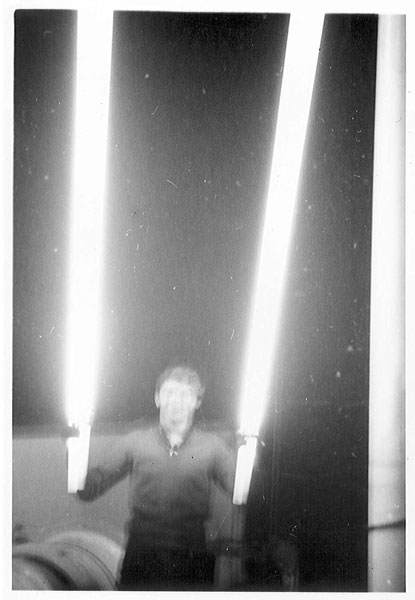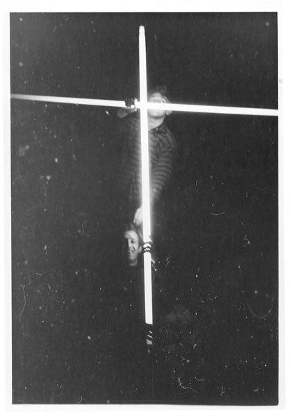 Roy, holding one fluorescent tube, with another tube held by a Dutch Engineer, to make a cross. |