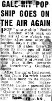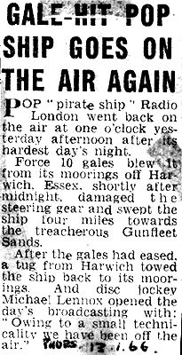 The ship was towed by the tug Kent and the station resumed broadcasting at 1300 hours with a special news bulletin about the overnight adventure, as soon as she returned to International Waters. The Galaxy was fully back in position by 1500 hours. Many quips were made about the unscheduled voyage, and DJs sang the words, "The station with the very loose anchor" over the PAMS jingle "The Station with the happy difference"! The first record played after Radio London's return to the airwaves was appropriately the #5 in the Fab Forty Day Tripper! Press adverts appeared the following day: To view a legible copy of this newspaper clipping, click on the picture. See MD Phillip Birch's letter of thanks to Captain Bill Buninga here. Only eight days later, Caroline's ship Mi Amigo ran aground at Frinton. |