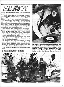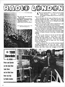 Peter and Gordon did confess elsewhere to having suffered from seasickness*, although this information is tactfully omitted from Moira's idyllic description, where the visitors were served a delicious lunch, with an apparently-noteworthy dessert of raspberry blancmange. The sea was blue and sparkling and life on a floating radio ship couldn't have been better. (Had my friends and I read the feature at the time, it would have confirmed our own fantasy vision of life aboard the good ship Galaxy. Possibly the seasickness might have been linked to the raspberry blancmange – Mary.)