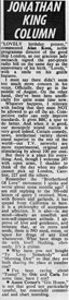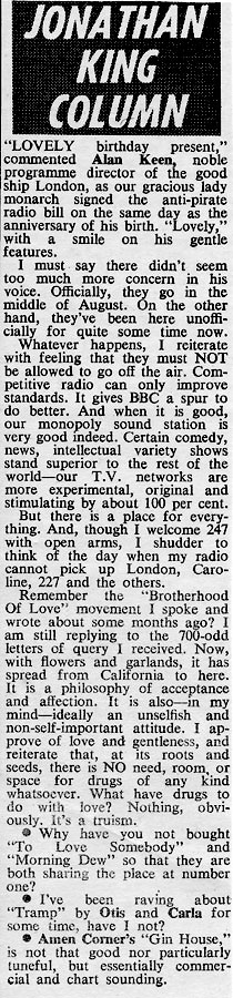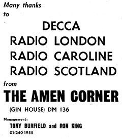 The Radio London Club Disc of the Week was titled Gin House Blues on prerelease copies, but on its release (21/07/67) the label title had been abbreviated to Gin House. From Alan's notes of the Fab 40 shows, and from surviving Curzon Street typed lists, the single appears always to have been announced as Gin House, right from its first appearance as Disc of the Week. According to this feature, the song was originally titled Me and My Gin. In his undated music paper column on the right, Jonathan King was less than complimentary about the Amen Corner single. He is, however, extremely impressed by To Love Somebody, Morning Dew (both already in the FF) and Soul Set track Tramp.(Click on column to see legible version) Music press 'thanks' clipping on the left and Jonathan King Column, from the the Luuk Meuwise archive, courtesy of Hans Knot |
