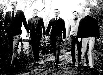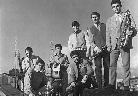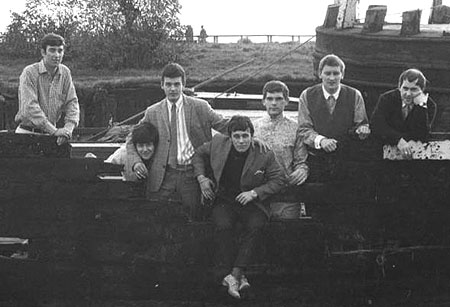 "Above and below are two photos of Roger Bloom's Hammer as they appeared on their records. The only addition was an acoustic rhythm guitar, Peter A Green (me). I am not shown on the band photo." |