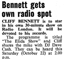 Cliff Bennett, whose LP 'Drivin You Wild' was a recent Album of the Week, gets a 30-minute Saturday afternoon slot to himself, sponsored by Elida hair products and presumably recorded at the Marquee as part of the Radio London Club afternoon. |