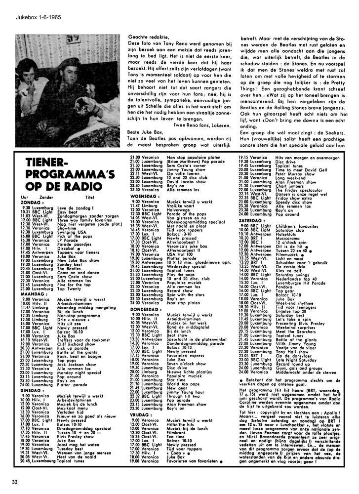 JUNE 1965 The schedule published in the June 1965 edition of 'Jukebox' is a cherry-picked compilation of listings for pop programmes that could be heard that month on local and UK stations and on Radio Luxembourg. Veronica, 208 and the BBC Light Programme are included but no other offshore broadcasters. The 'Jukebox' listings complier has covered pretty much any show on the Light Programme that played a variety of music, but might feature a pop record - such as the request shows Children's Favourites and Three Way Family Favourites. The main BBC programmes aimed at teenagers naturally held weekend slots. Saturday Club and Sunday morning's Easy Beat, both presented by Brian Matthew, featured mainly live performances with studio bands and guests from the charts. Brian Fahey & His Orchestra, The Mike Leander Orchestra and Arthur Greenslade & The Gee Men all played sessions during June 65. Special guests included Fab Forty acts Donovan, Georgie Fame & The Blue Flames, Sons of Fred and Them. Pick of the Pops was Sunday afternoon's rare, all-vinyl treat and included the eagerly-awaited weekly sales chart rundown. On weekdays at 1700, 'Newly Pressed' supplemented the meagre needletime allowance, as spinning a new single was regarded as a review. As long as the record label was mentioned the latest releases were exempt from the regulation. Saturday Club, Easy Beat and Pick of the Pops all included segments that took advantage of this 'get-out' clause. Luxembourg DJs at the time included Sam Costa, Alan Freeman, Jack Jackson, Jimmy Young, Brian Matthew with his Pop Parade and Jimmy Savile's Teen and Twenty Disc Club. Both Veronica and 208 had programmes dedicated to Elvis. Veronica also showcased Cliff Richard and 208, the Beatles. On Wednesday evenings Veronica aired the US Hot Hundred. |