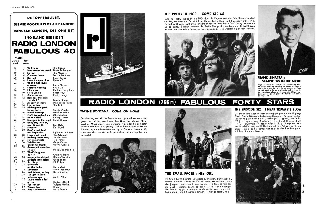 JULY 1966 We now see a pattern established in the 'Jukebox' Belgian edition for the published Fab Forty being the chart from the middle of the previous month, often the one for the week commencing with the second Sunday of that month. July's featured chart was from 12th June. Although pictured in the 'Fab Fortiers' section, Fontella Bass had not been seen on the Radio London playlist since May 29th, when 'I Can't Rest' was at #22. |