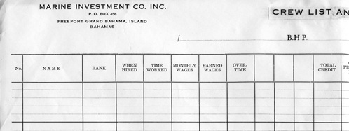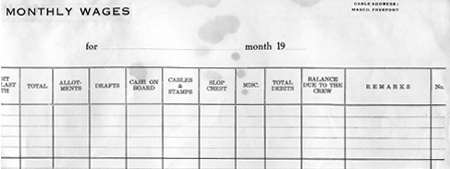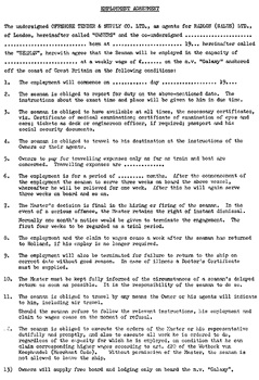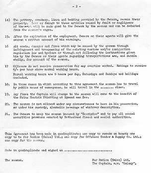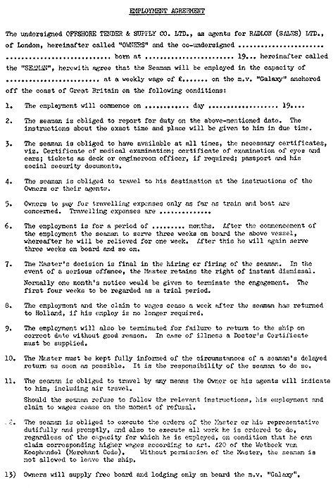 The employment agreement for seamen working aboard the Galaxy. The captain would sign the document on behalf of Radlon Sales Ltd and the seaman would counter-sign it. Quadruplicate copies of the completed document were made. One retained on board the ship, a second kept by Radlon Sales, a third sent to Offshore Tender and Supply Company Ltd and a fourth kept by the seaman himself. (Click on the small pictures of pages one and two of the agreement to see legible verions.) |