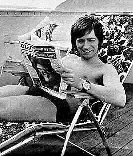 Left, is Larry Tremaine at the mic, with his wife Carol. The second man in the photo is believed to be Larry's brother. Right, is Alan West, sunning himself aboard the Mebo in 1970, whilst perusing the pages of Disc and Music Echo. |