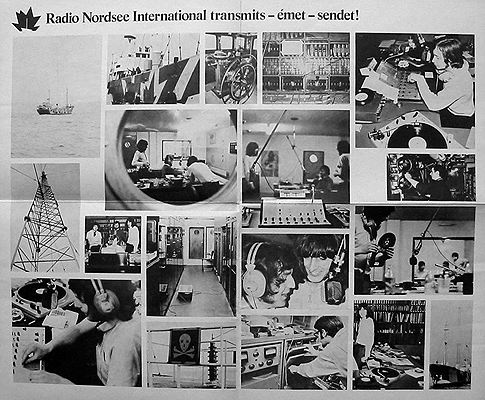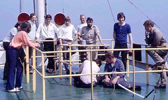 "The 'crew' on deck trying to get the transmitter working. (l to r) Andy Archer (partly hidden), Roger Day, Duncan Johnson, Peter Chicago, ?, captain Onnes, Koos van Duin, Dave Hawkins, Dirk Adrichem. The 2 people sitting remain unidentified. The Dutch engineer with the black beard, Koos van Duin, was driving the Mebo II during the crossing, when everyone else was in the green room." Ex- Radio London engineers Russell Tollerfield and Dave Hawkins were visiting the Mebo to fix transmitter problems, as reported here. |